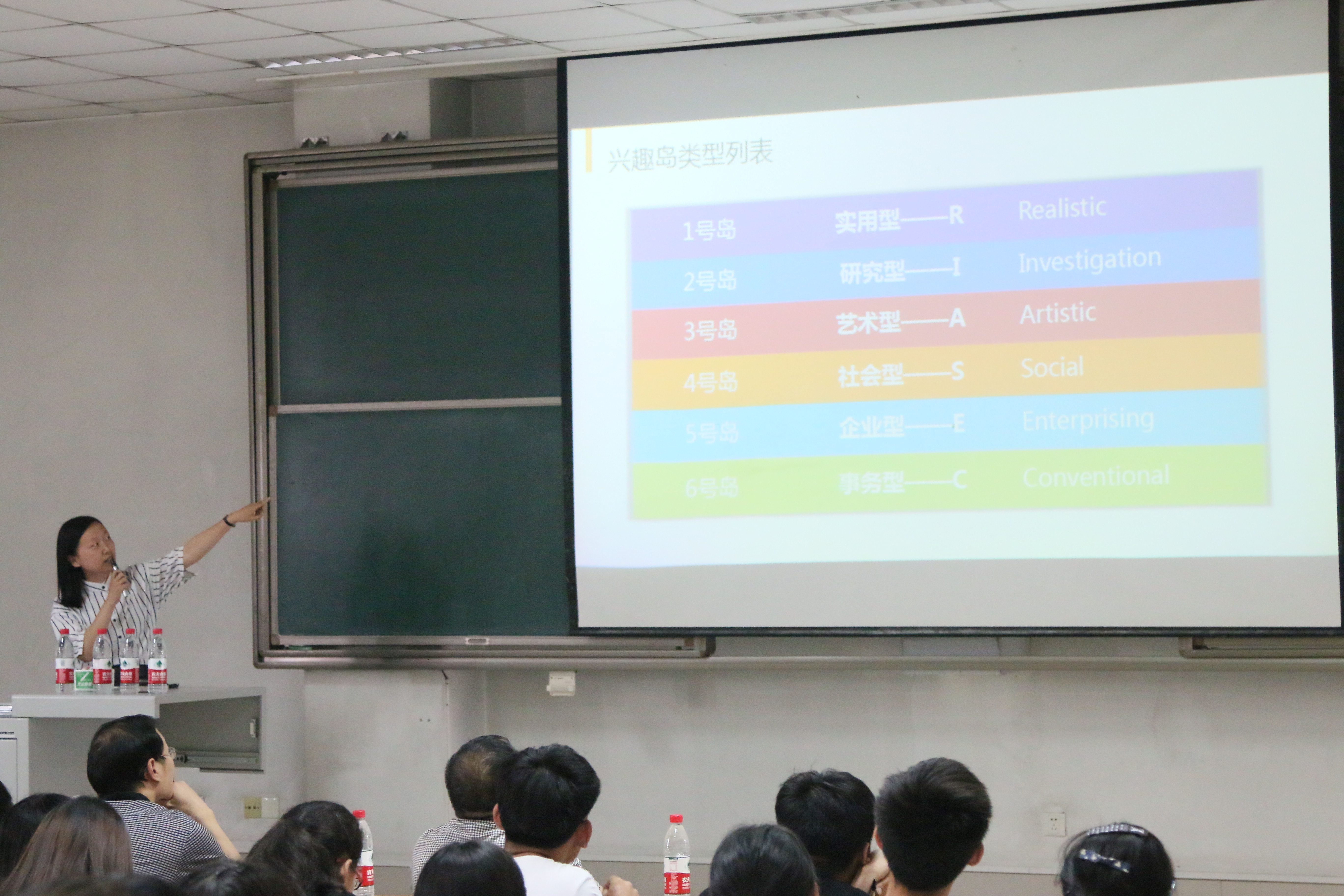 讲座以“分享经验技巧,找到更好的自己”为题与同学们分享职业规划方法,答疑解惑。徐晓音首先以互动游戏开始讲座,为大家点明“有目标才会有针对性”的道理。在“认识自我”方面,通过小测试让大家了解自己是什么类型的人,适合从事什么样的职业;在“了解职业”的过程中提出了“职业=行业+职位+企业+地区”这一公式,使学生们对职业这个词语有了更深的了解;在“生涯规划”环节,徐老师指出了在求职时会经历“一口饭”、“一份工”、“一个梦”三个阶段,建议同学们在学好专业课的前提下,充分利用学校图书馆的资源,提高自身技能,在课余时间去实地了解理想职位的具体情况。
