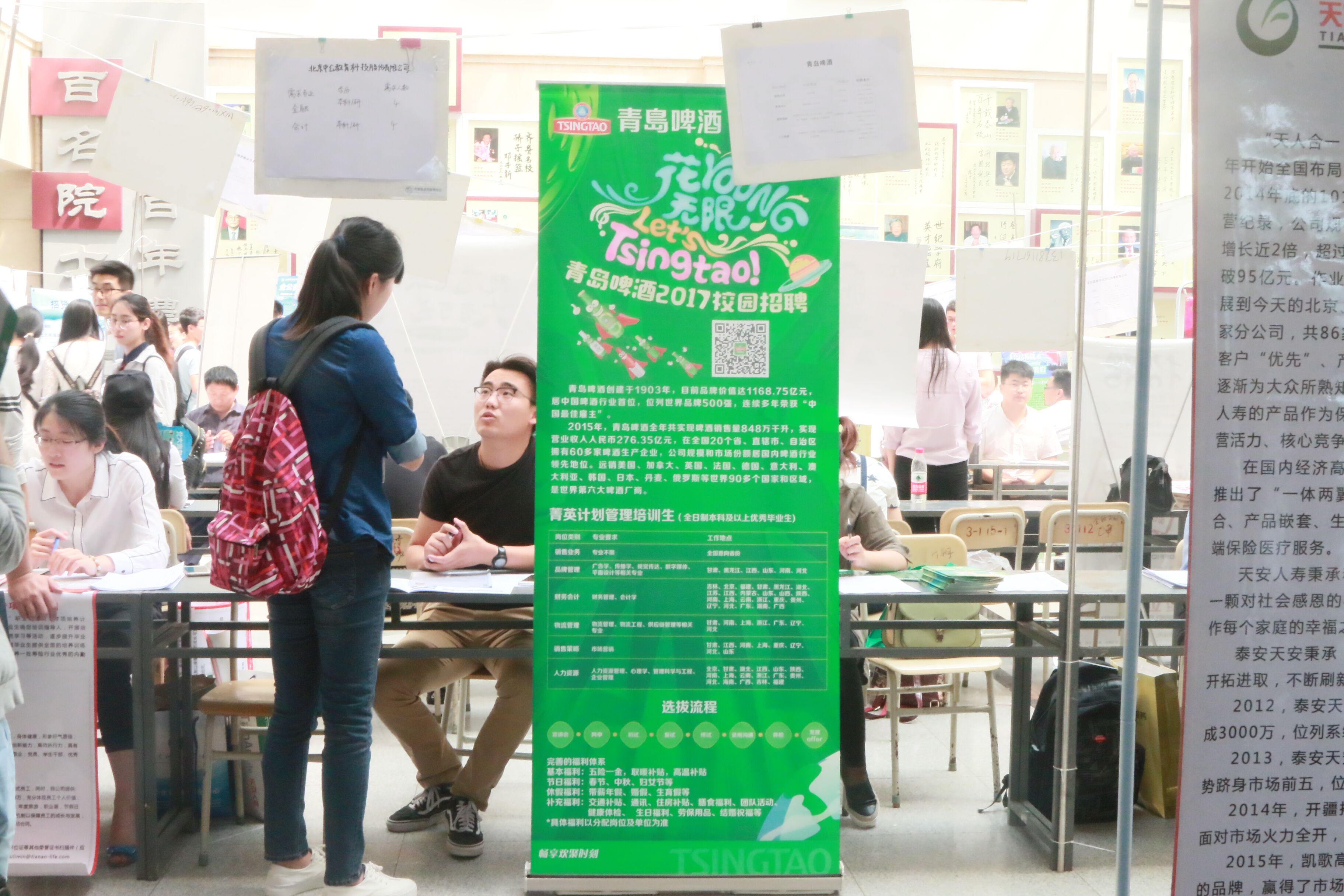 5月17日上午,经管学院成功举办经济管理类毕业生校园招聘会,太平洋人寿、招商银行、青岛啤酒等90余家大中型企业前来招贤纳士,提供就业岗位近2600个,吸引了大批2017届毕业生前来咨询。