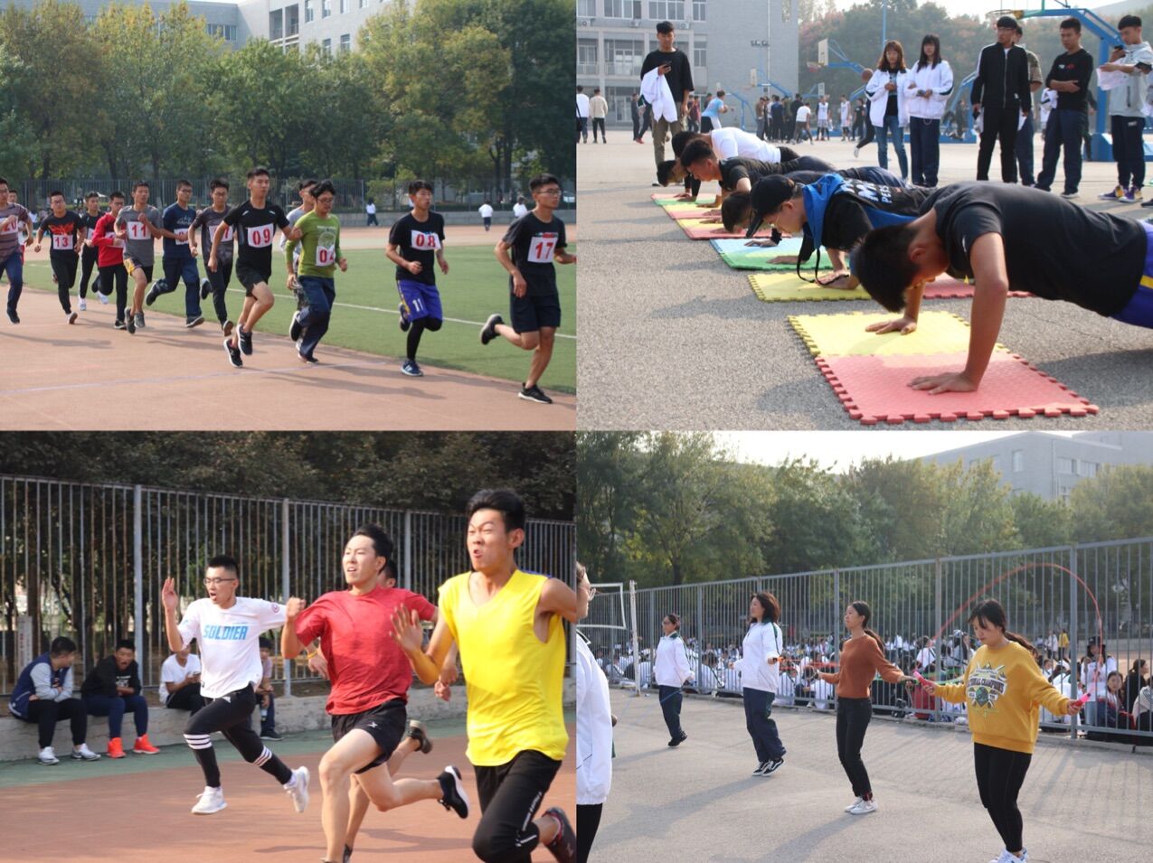 本次运动会有100米、800米、4×100米接力、跳远、跳高等传统田径项目,还进行了60米抱球跑、俯卧撑、踢毽子、集体跳大绳等大众体育趣味项目。新生们积极参赛,秉承“友谊第一、比赛第二”的原则,奋力拼搏,不言放弃。排球、乒乓球项目的师生友谊赛更是吸引了全场的焦点,为师生之间搭建了一个交流互动的平台,增进了师生之间的情谊。