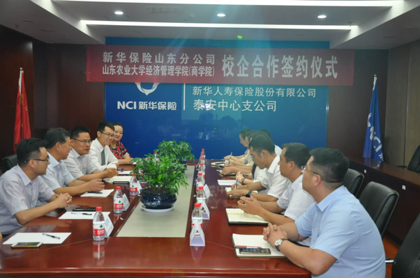 6月28日10时30分,经济管理学院(商学院)与新华人寿保险山东分公司校企合作签约仪式于泰山国际金融中心举行。签约仪式开始前,双方进行了较为深入的座谈,经济管理学院(商学院)副院长徐宣国教授首先介绍了学院的发展历史和现状,提出双方合作的基本框架与思路。新华保险山东分公司人力资源部总经理杨燕燕女士介绍了新华保险公司的发展历程,提出了公司发展对于人才的相关需求。新华保险泰安中心支公司韩鹏总经理介绍了公司未来在泰安高校的招聘计划与安排。